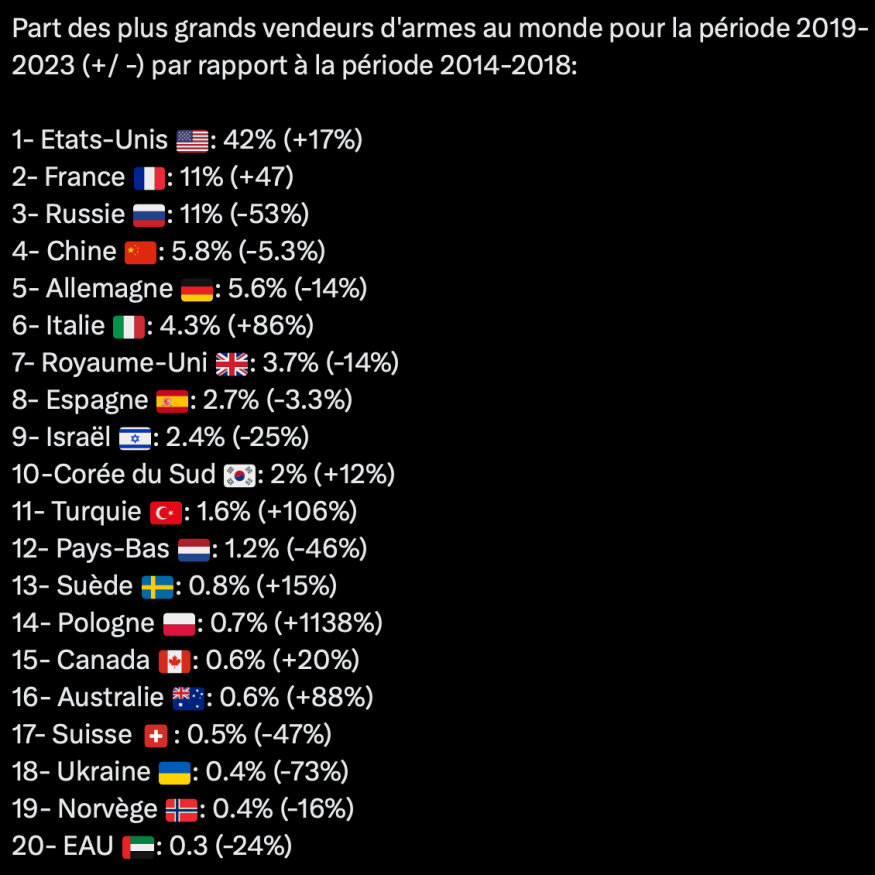 La France est le deuxième plus gros exportateur d’armes au monde, suivie par la Russie, la Chine, l'Allemagne, l'Italie, le Royaume-Uni, l'Espagne et donc Israël. Le dixième plus gros vendeur mondial d’armes est la Corée du Sud.